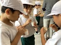 1,2年生は、せっかく準備していた水着に着替え、外で水遊びをしました。水着への着替えの練習と、水に慣れるということで、楽しんでいました。