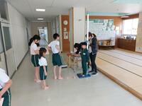 1年生は、6年生のお兄さん、お姉さんと一緒にそれぞれの計測を行いました。