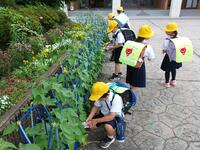 毎日少しずつお世話をしてきたアサガオは、ぐんぐんと成長し、今では1年生の背丈に届くほど立派に育ちました。