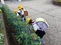 天気のよい朝、登校してきた1年生たちが、自分の育てているアサガオに水やりをしています。