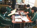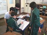 一方、6年生は算数の授業に取り組んでいました。アルファベットを図形としてとらえ、その特徴についてグループで話し合っていました。折り曲げると重なる形や、回転させても同じになる形など、実際に手を動かしながら考えを深めていました。